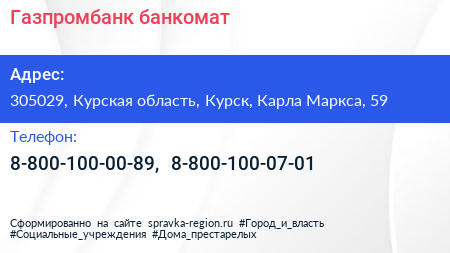 Газпромбанк, банкомат по адресу 305029, Курская область, Курск, Карла Маркса, 59 в дальнейшем Организация, размещена в следующих категориях:
