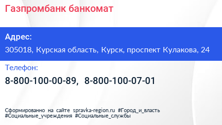 Газпромбанк, банкомат по адресу 305018, Курская область, Курск, проспект Кулакова, 24 в дальнейшем Организация, размещена в следующих категориях: