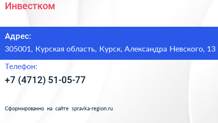 Инвестком по адресу 305001, Курская область, Курск, Александра Невского, 13 в дальнейшем Организация, размещена в следующих категориях: