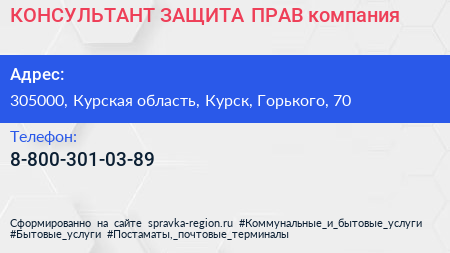 КОНСУЛЬТАНТ-ЗАЩИТА ПРАВ, компания по адресу 305000, Курская область, Курск, Горького, 70 в дальнейшем Организация, размещена в следующих категориях: