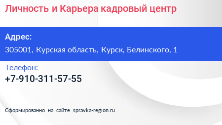 Личность и Карьера, кадровый центр по адресу 305001, Курская область, Курск, Белинского, 1 в дальнейшем Организация, размещена в следующих категориях: