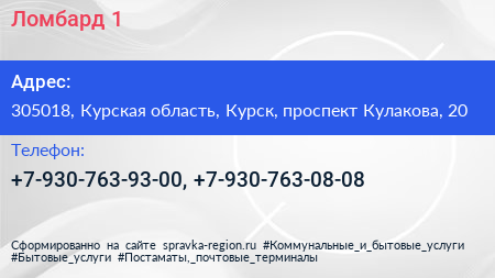 Ломбард №1 по адресу 305018, Курская область, Курск, проспект Кулакова, 20 в дальнейшем Организация, размещена в следующих категориях: