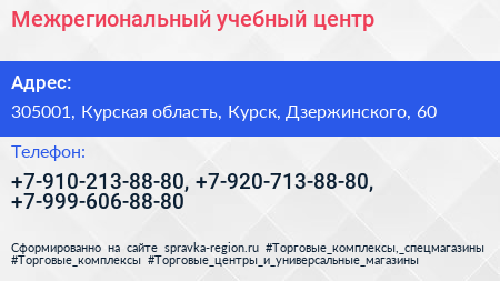 Межрегиональный учебный центр по адресу 305001, Курская область, Курск, Дзержинского, 60 в дальнейшем Организация, размещена в следующих категориях:
