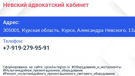 Невский, адвокатский кабинет по адресу 305001, Курская область, Курск, Александра Невского, 13а в дальнейшем Организация, размещена в следующих категориях: