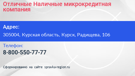 Отличные Наличные, микрокредитная компания по адресу 305004, Курская область, Курск, Радищева, 106 в дальнейшем Организация, размещена в следующих категориях: