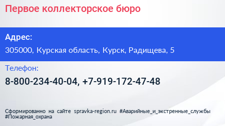 Первое коллекторское бюро по адресу 305000, Курская область, Курск, Радищева, 5 в дальнейшем Организация, размещена в следующих категориях: