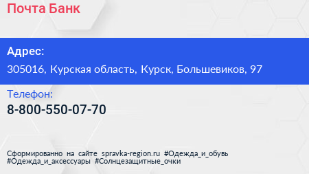 Почта Банк по адресу 305016, Курская область, Курск, Большевиков, 97 в дальнейшем Организация, размещена в следующих категориях: