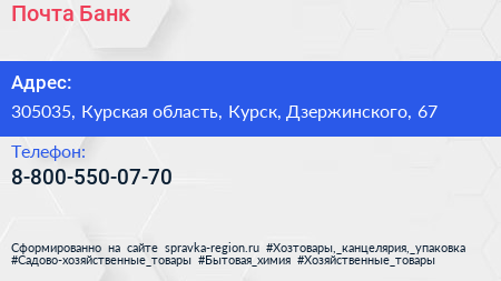 Почта Банк по адресу 305035, Курская область, Курск, Дзержинского, 67 в дальнейшем Организация, размещена в следующих категориях: