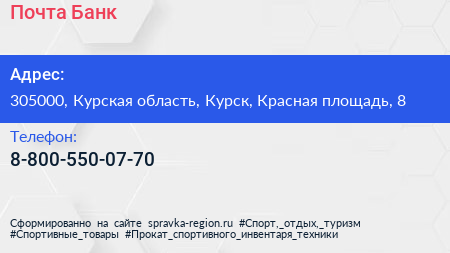 Почта Банк по адресу 305000, Курская область, Курск, Красная площадь, 8 в дальнейшем Организация, размещена в следующих категориях: