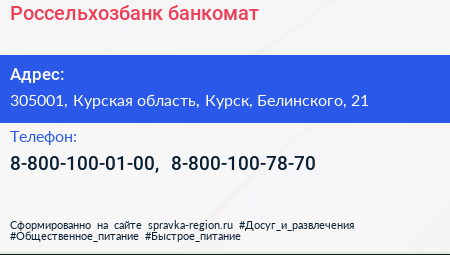 Россельхозбанк, банкомат по адресу 305001, Курская область, Курск, Белинского, 21 в дальнейшем Организация, размещена в следующих категориях: