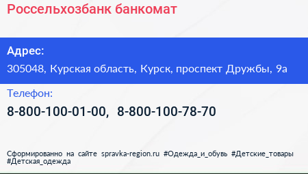 Россельхозбанк, банкомат по адресу 305048, Курская область, Курск, проспект Дружбы, 9а в дальнейшем Организация, размещена в следующих категориях:
