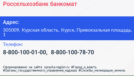Россельхозбанк, банкомат по адресу 305009, Курская область, Курск, Привокзальная площадь, 1 в дальнейшем Организация, размещена в следующих категориях: