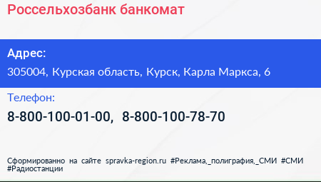 Россельхозбанк, банкомат по адресу 305004, Курская область, Курск, Карла Маркса, 6 в дальнейшем Организация, размещена в следующих категориях:
