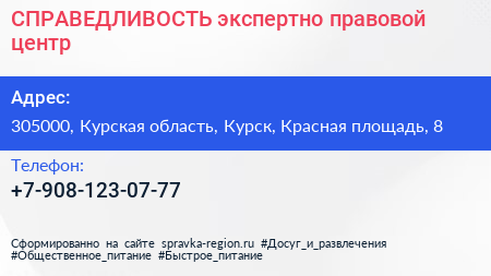 СПРАВЕДЛИВОСТЬ, экспертно-правовой центр по адресу 305000, Курская область, Курск, Красная площадь, 8 в дальнейшем Организация, размещена в следующих категориях: