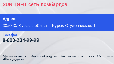 SUNLIGHT, сеть ломбардов по адресу 305040, Курская область, Курск, Студенческая, 1 в дальнейшем Организация, размещена в следующих категориях: