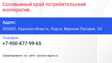 Соловьиный край, потребительский кооператив по адресу 305001, Курская область, Курск, Верхняя Луговая, 24 в дальнейшем Организация, размещена в следующих категориях: