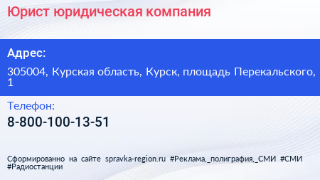 Юрист, юридическая компания по адресу 305004, Курская область, Курск, площадь Перекальского, 1 в дальнейшем Организация, размещена в следующих категориях: