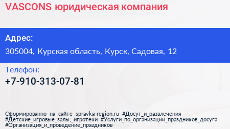 VASCONS, юридическая компания по адресу 305004, Курская область, Курск, Садовая, 12 в дальнейшем Организация, размещена в следующих категориях: