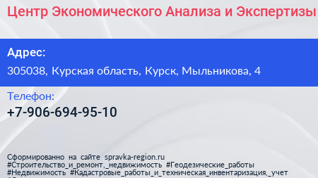 Центр Экономического Анализа и Экспертизы по адресу 305038, Курская область, Курск, Мыльникова, 4 в дальнейшем Организация, размещена в следующих категориях: