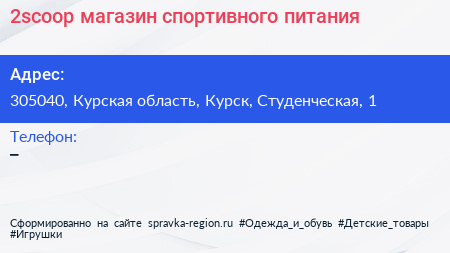 2scoop, магазин спортивного питания по адресу 305040, Курская область, Курск, Студенческая, 1 в дальнейшем Организация, размещена в следующих категориях: