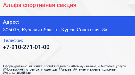 Альфа, спортивная секция по адресу 305016, Курская область, Курск, Советская, 3а в дальнейшем Организация, размещена в следующих категориях: