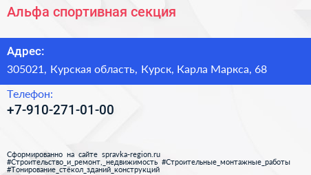 Альфа, спортивная секция по адресу 305021, Курская область, Курск, Карла Маркса, 68 в дальнейшем Организация, размещена в следующих категориях: