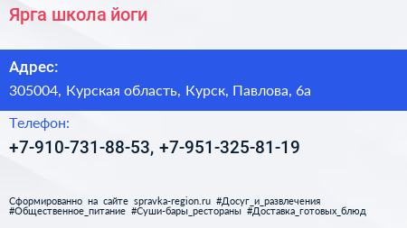 Ярга, школа йоги по адресу 305004, Курская область, Курск, Павлова, 6а в дальнейшем Организация, размещена в следующих категориях: