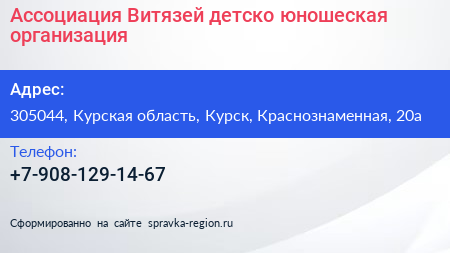 Ассоциация Витязей, детско-юношеская организация по адресу 305044, Курская область, Курск, Краснознаменная, 20а в дальнейшем Организация, размещена в следующих категориях: