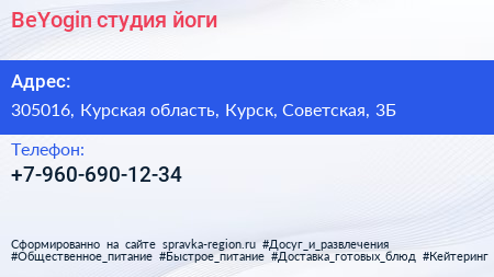 BeYogin, студия йоги по адресу 305016, Курская область, Курск, Советская, 3Б в дальнейшем Организация, размещена в следующих категориях: