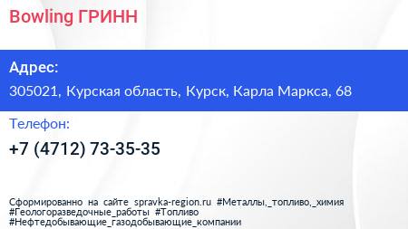 Bowling ГРИНН по адресу 305021, Курская область, Курск, Карла Маркса, 68 в дальнейшем Организация, размещена в следующих категориях: