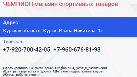 ЧЕМПИОН, магазин спортивных товаров по адресу Курская область, Курск, Ивана Никитина, 1г в дальнейшем Организация, размещена в следующих категориях: