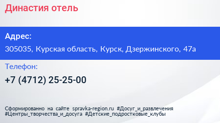 Династия, отель по адресу 305035, Курская область, Курск, Дзержинского, 47а в дальнейшем Организация, размещена в следующих категориях: