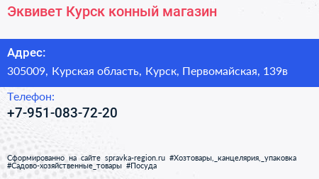 Эквивет-Курск, конный магазин по адресу 305009, Курская область, Курск, Первомайская, 139в в дальнейшем Организация, размещена в следующих категориях:
