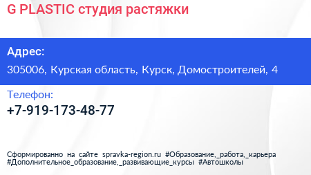 G-PLASTIC, студия растяжки по адресу 305006, Курская область, Курск, Домостроителей, 4 в дальнейшем Организация, размещена в следующих категориях: