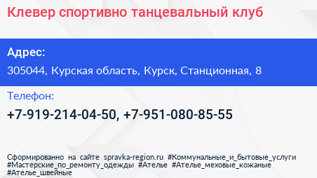 Клевер, спортивно-танцевальный клуб по адресу 305044, Курская область, Курск, Станционная, 8 в дальнейшем Организация, размещена в следующих категориях:
