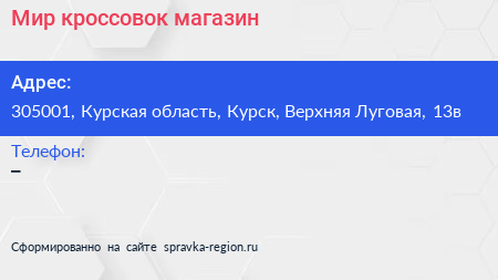 Мир кроссовок, магазин по адресу 305001, Курская область, Курск, Верхняя Луговая, 13в в дальнейшем Организация, размещена в следующих категориях: