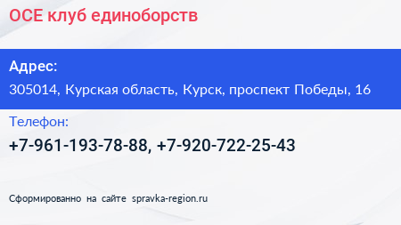 ОСЕ, клуб единоборств по адресу 305014, Курская область, Курск, проспект Победы, 16 в дальнейшем Организация, размещена в следующих категориях: