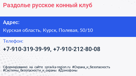 Раздолье русское, конный клуб по адресу Курская область, Курск, Полевая, 50/10 в дальнейшем Организация, размещена в следующих категориях: