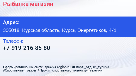 Рыбалка, магазин по адресу 305018, Курская область, Курск, Энергетиков, 4/1 в дальнейшем Организация, размещена в следующих категориях: