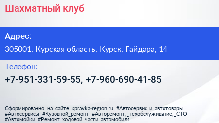 Шахматный клуб по адресу 305001, Курская область, Курск, Гайдара, 14 в дальнейшем Организация, размещена в следующих категориях: