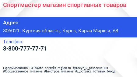 Спортмастер, магазин спортивных товаров по адресу 305021, Курская область, Курск, Карла Маркса, 68 в дальнейшем Организация, размещена в следующих категориях:
