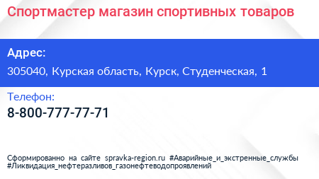 Спортмастер, магазин спортивных товаров по адресу 305040, Курская область, Курск, Студенческая, 1 в дальнейшем Организация, размещена в следующих категориях: