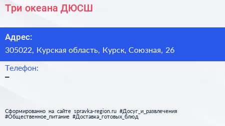 Три океана, ДЮСШ по адресу 305022, Курская область, Курск, Союзная, 26 в дальнейшем Организация, размещена в следующих категориях: