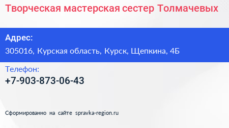Творческая мастерская сестер Толмачевых по адресу 305016, Курская область, Курск, Щепкина, 4Б в дальнейшем Организация, размещена в следующих категориях: