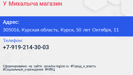 У Михалыча, магазин по адресу 305016, Курская область, Курск, 50 лет Октября, 11 в дальнейшем Организация, размещена в следующих категориях: