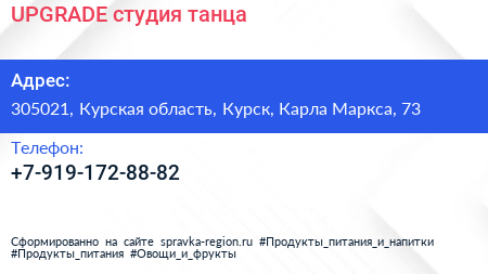 UPGRADE, студия танца по адресу 305021, Курская область, Курск, Карла Маркса, 73 в дальнейшем Организация, размещена в следующих категориях: