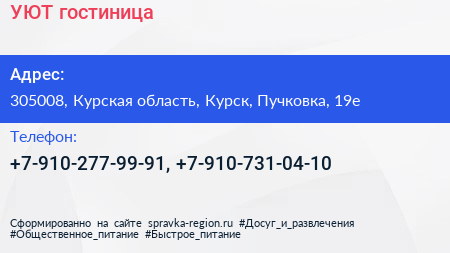 УЮТ, гостиница по адресу 305008, Курская область, Курск, Пучковка, 19е в дальнейшем Организация, размещена в следующих категориях: