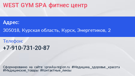 WEST GYM SPA, фитнес-центр по адресу 305018, Курская область, Курск, Энергетиков, 2 в дальнейшем Организация, размещена в следующих категориях: