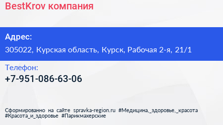 BestKrov, компания по адресу 305022, Курская область, Курск, Рабочая 2-я, 21/1 в дальнейшем Организация, размещена в следующих категориях: