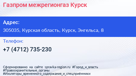 Газпром межрегионгаз Курск по адресу 305035, Курская область, Курск, Энгельса, 8 в дальнейшем Организация, размещена в следующих категориях: